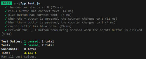 <button data-testid="minus-button" onClick={()=>setCount(prev=>prev + 1)} disabled = {disabled} > - </button> <button data-testid="plus-button" onClick={()=>setCount(prev=> prev + 1)} disabled = {disabled} > + </button> <div> <button style={{backgroundColor : "blue" }} data-testid="on/off-button" onClick={()=> setDisabled(prev=> !prev)}> on/off </button> </div>