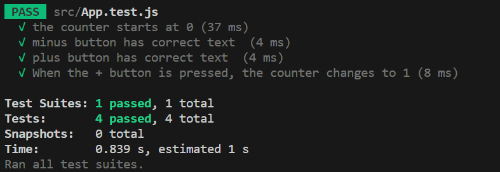 test('When the + button is pressed, the counter changes to 1', () => { render(<App/ >); const buttonElement = screen.getByTestId("plus-button"); fireEvent.click(buttonElement); const counterElement = screen.getByTestId("counter"); expect(counterElement).toHaveTextContent(1); });