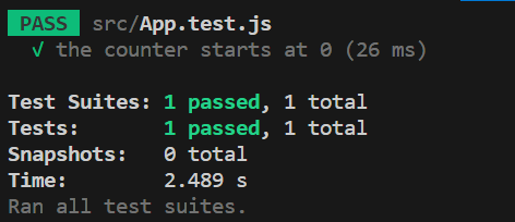 import { render, screen } from '@testing-library/react'; import App from './App'; test('the counter starts at 0', () => { render(<App />); const counterElement =screen.getByTestId("counter"); expect(counterElement).toHaveTextContent(0); });