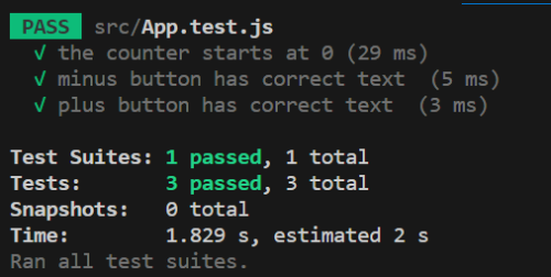 import { render, screen } from '@testing-library/react'; import App from './App'; test('the counter starts at 0', () => { render(<App />); const counterElement =screen.getByTestId("counter"); expect(counterElement).toBe(0); });
