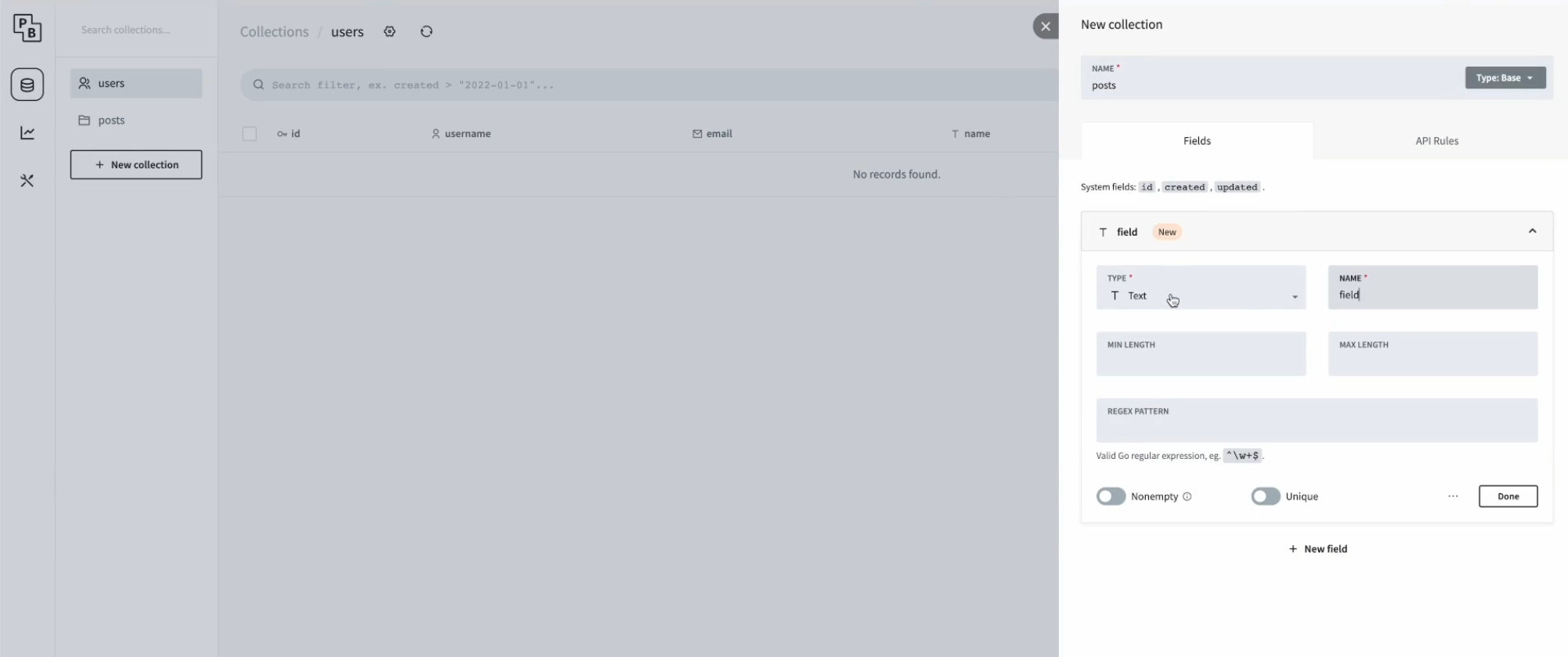./pocketbase server-> 서버가 실행되면, 회원가입을 진행하고 로그인 후 New Collection 탭에 들어간다.